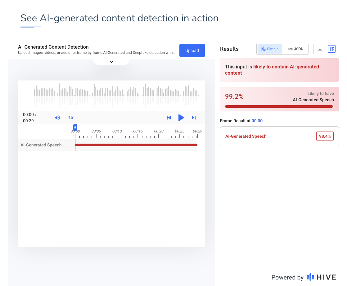 Hive Moderation said that the sound was 99.2% likely to have been created by AI:
