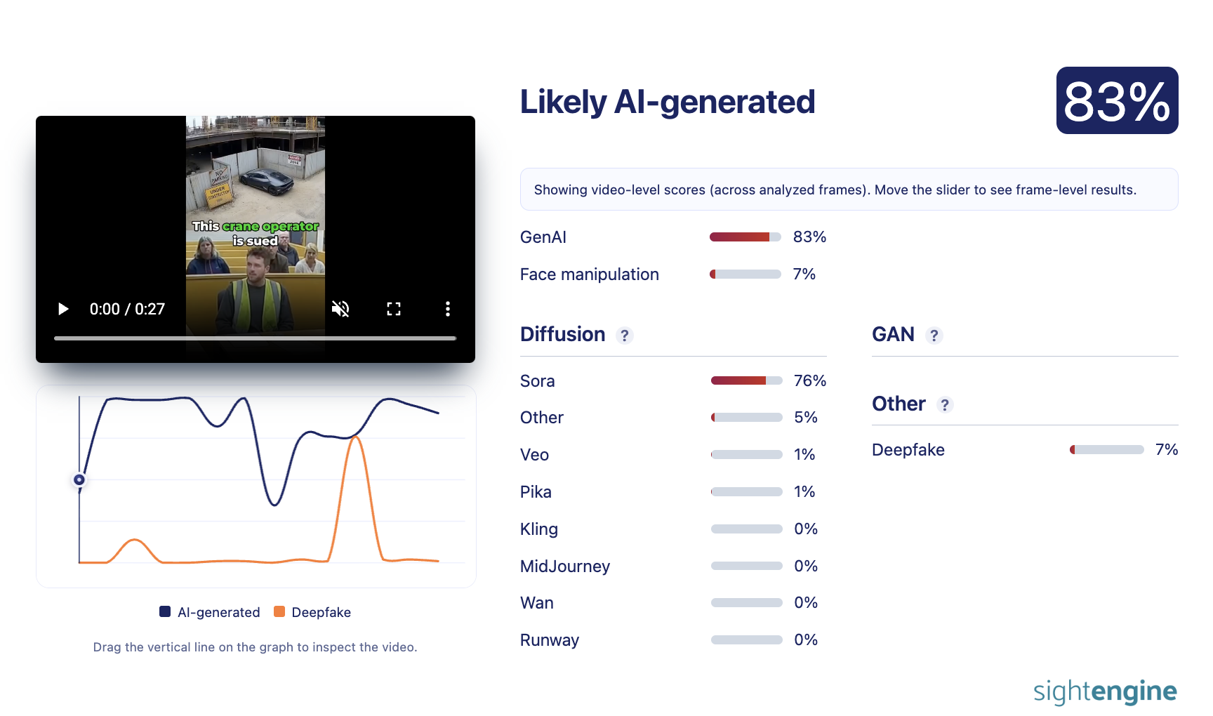 AI detector Sightengine said the probability of the video being AI-generated was 83 percent: