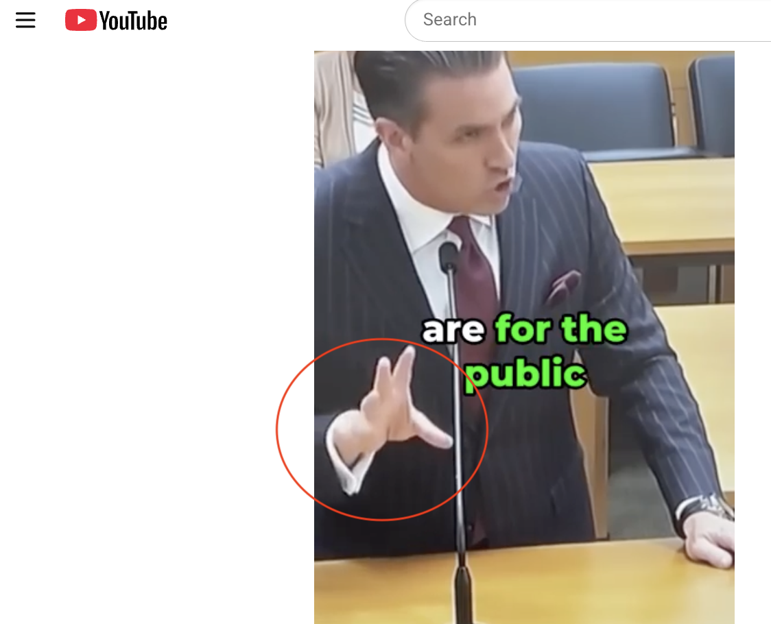As the clip moved to show what looked like selected fragments of the supposed court hearing, we see the purported CEO testifying. At the 0:49 mark, his little finger mysteriously disappears only to reappear moments later: