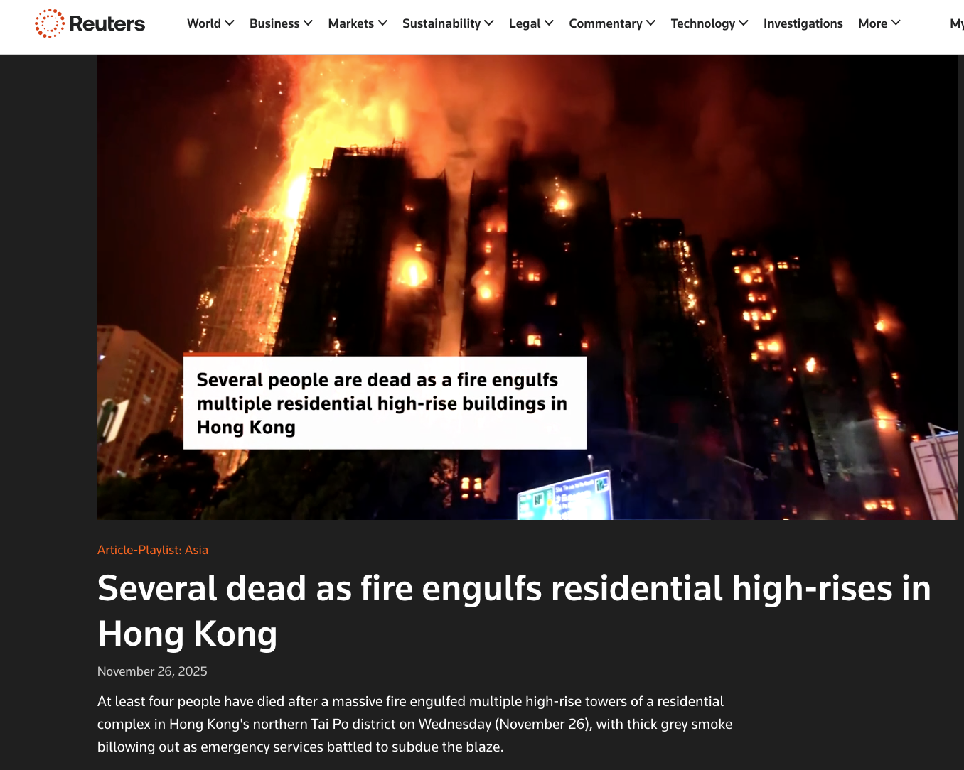 Reuters published a video (archived here) of the fire with the headline, "Several dead as fire engulfs residential high-rises in Hong Kong," on Nov. 26, 2025. The caption for the video said: