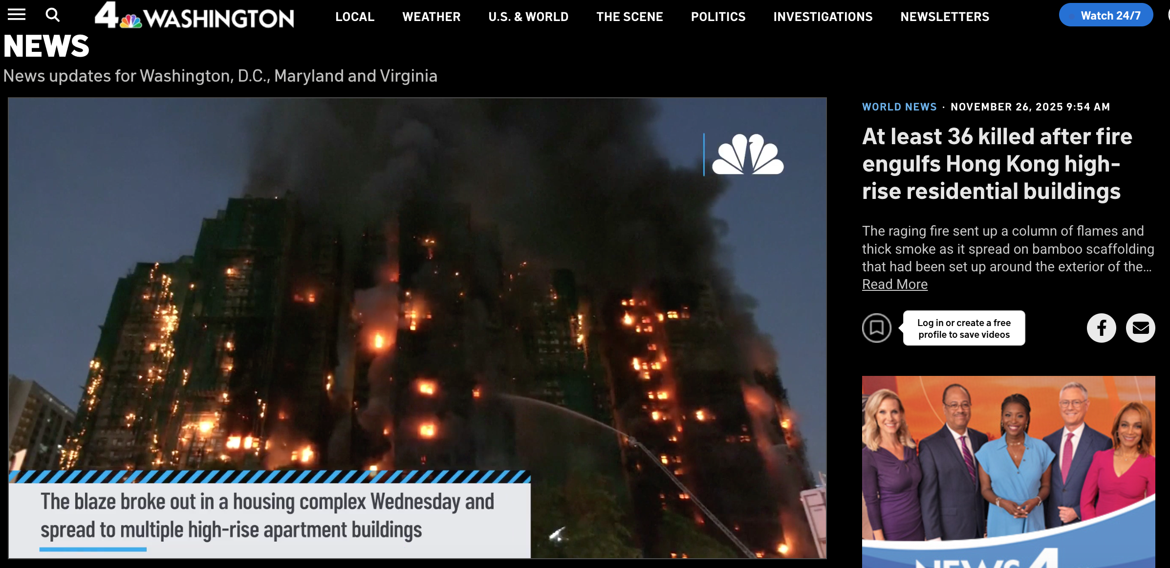 News of the Hong Kong fire was reported by multiple outlets, including NBC Washington (archived here), with the same video as seen here: