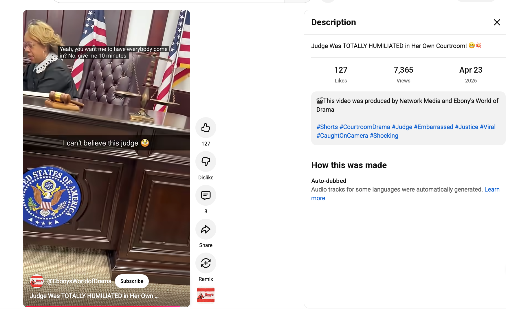 A Google search using a screenshot from the video matched one posted by comedian Merkerson on her YouTube account @EbonysWorldofDrama on April 23, 2026. Her bio reads, "Welcome to Ebony's World of Drama! I film and star in scripted dramas. Subscribe and Enjoy!" Here is a screenshot of the search: