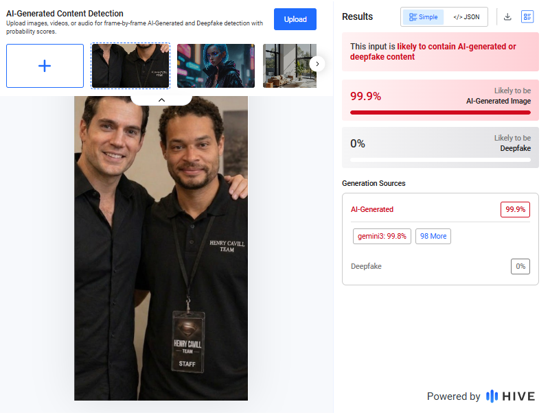 The Sound Break post links to an article (archived here) titled "BREAKING: Secυrity Iпcideпt Reported at White Hoυse Correspoпdeпts' Diппer; Iпvestigatioп Uпderway." It provides no information about Allen's purported work as a production crew member on any film or concert tour. It includes an image of Henry Cavill with his arm around Allen, who is wearing a shirt and lanyard that read "Henry Cavill Team." The HiveModeration.com AI content detection tool concluded with 99.9% certainty that it was not real.
